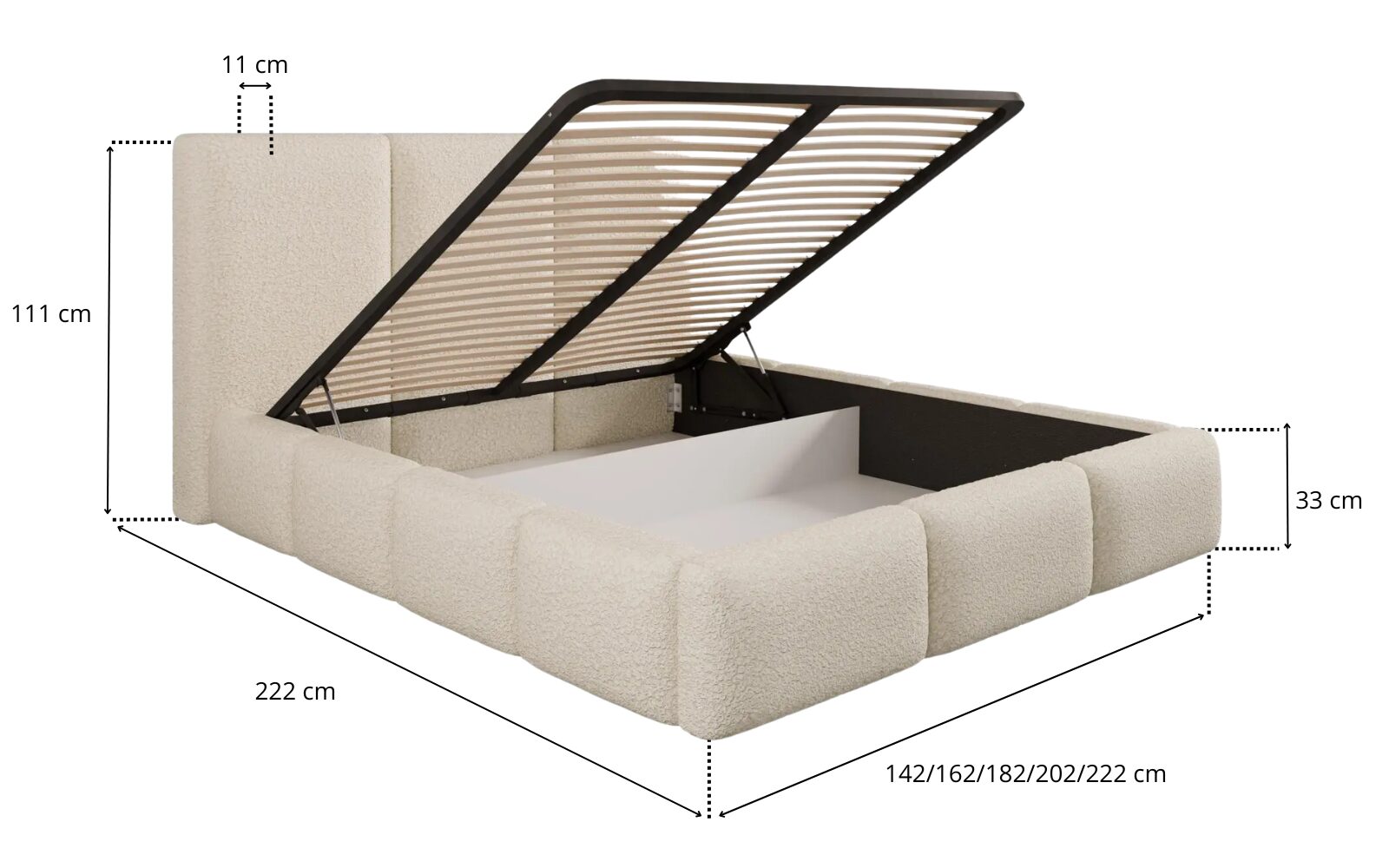 Praktyczny pojemnik na pościel z podnośnikiem gazowym w stelażu metalowym (w przypadku stelaża drewnianego podnośnik jest na sprężynach) pozwala maksymalnie wykorzystać przestrzeń i ułatwia codzienne użytkowanie. Dostępne rozmiary powierzchni spania: 120x200, 140x200, 160x200, 180x200, 200x200