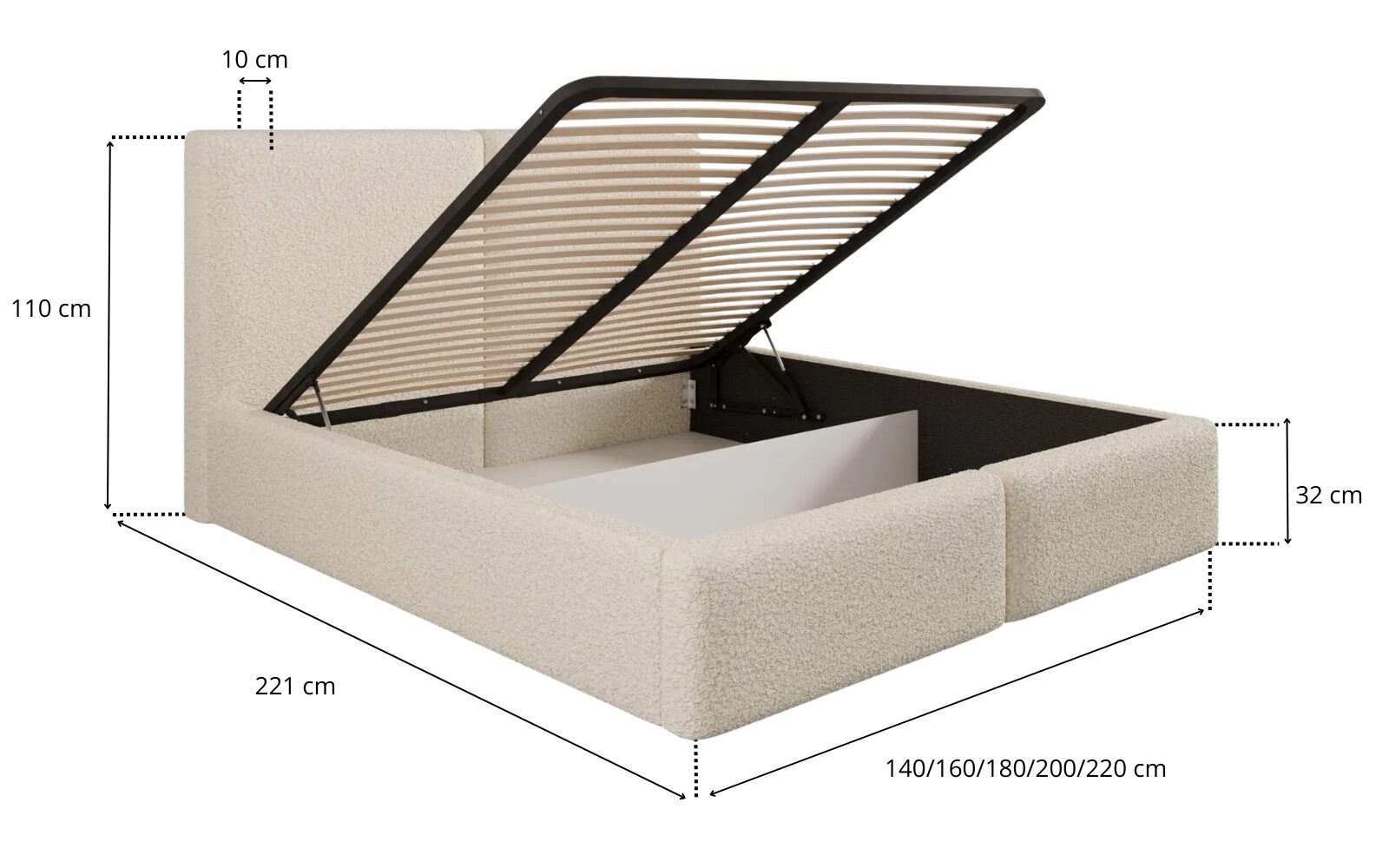 Praktyczny pojemnik na pościel z podnośnikiem gazowym w stelażu metalowym (w przypadku stelaża drewnianego podnośnik jest na sprężynach) pozwala maksymalnie wykorzystać przestrzeń i ułatwia codzienne użytkowanie. Dostępne rozmiary powierzchni spania: 120x200, 140x200, 160x200, 180x200, 200x200