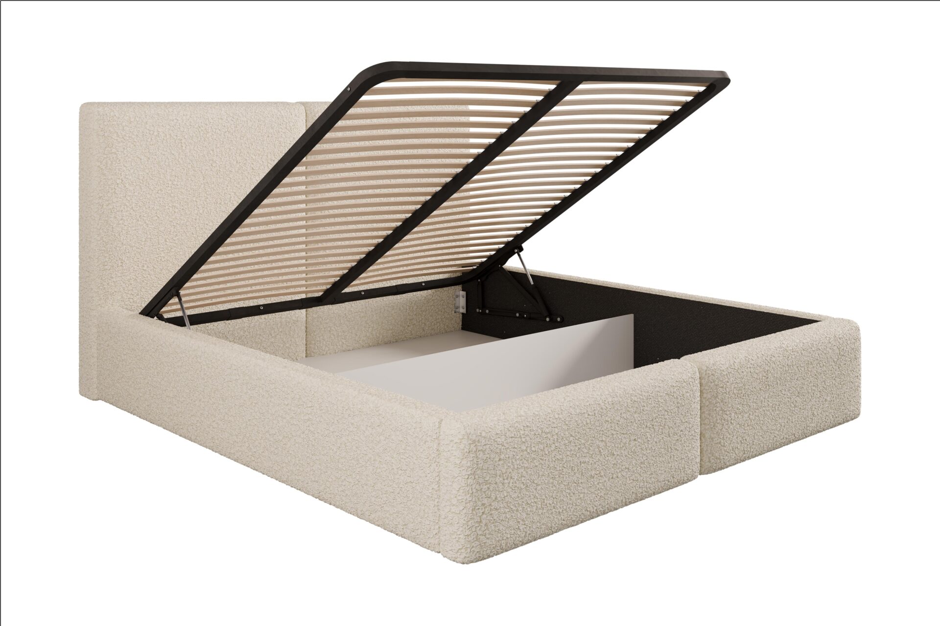 Praktyczny pojemnik na pościel z podnośnikiem gazowym w stelażu metalowym (w przypadku stelaża drewnianego podnośnik jest na sprężynach) pozwala maksymalnie wykorzystać przestrzeń i ułatwia codzienne użytkowanie. Dostępne rozmiary powierzchni spania: 120x200, 140x200, 160x200, 180x200, 200x200