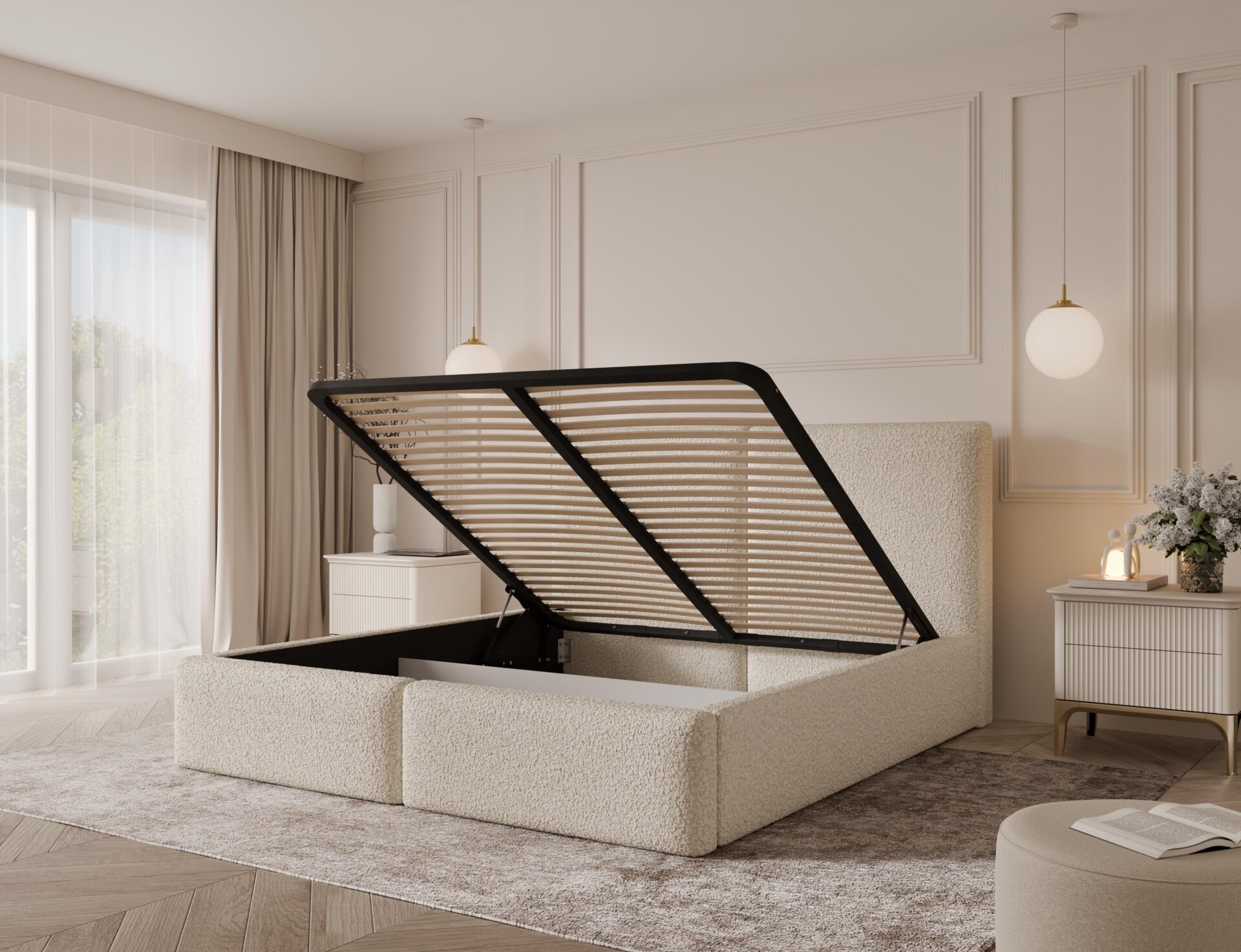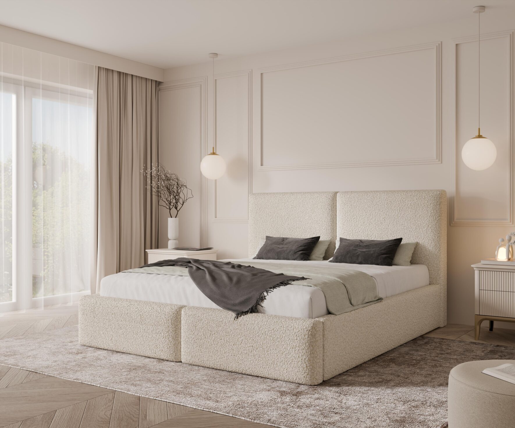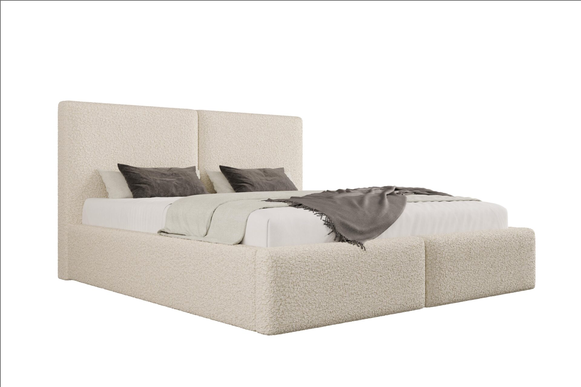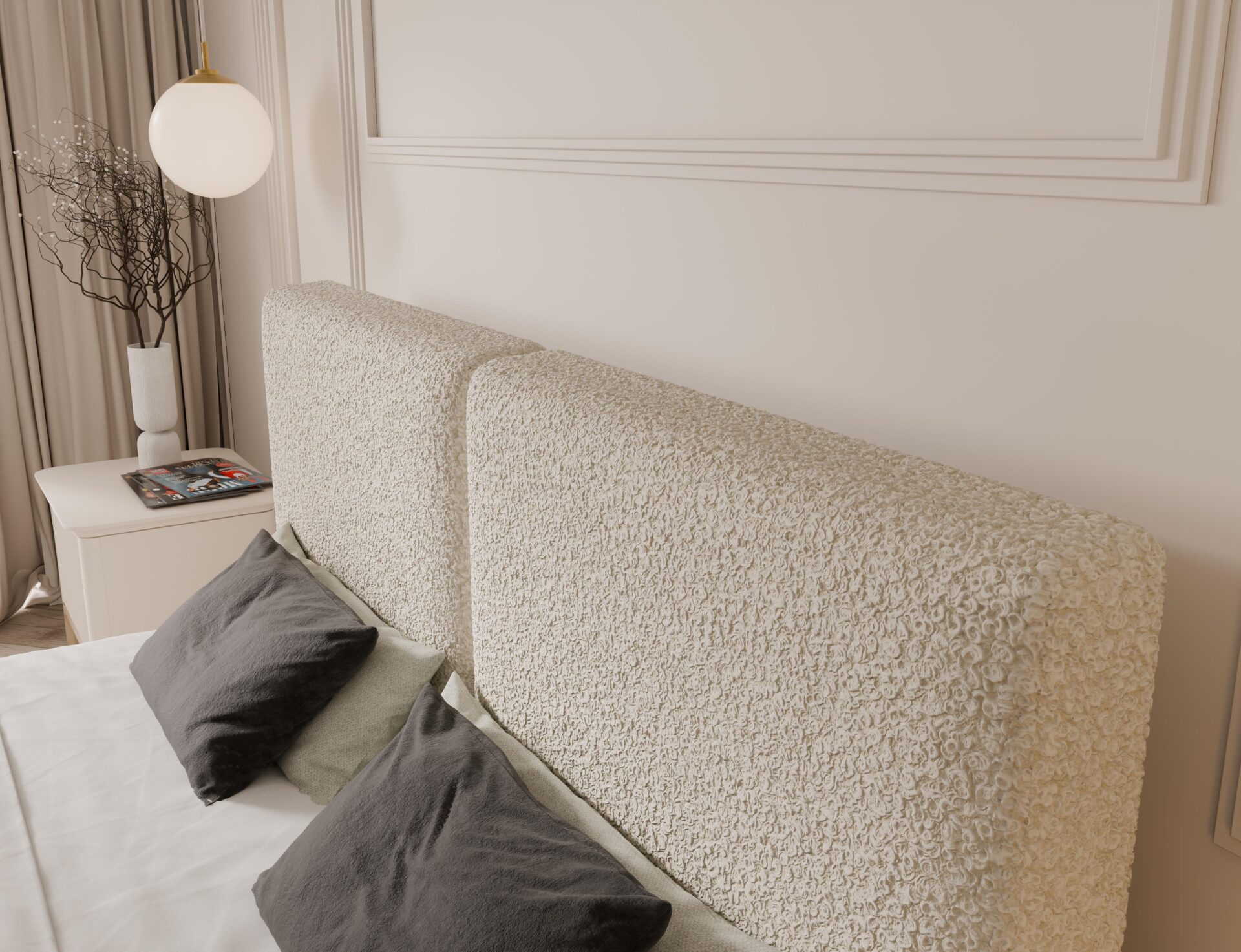 Wysokie, miękkie zagłowie oraz grube boczki zapewniają wygodę użytkowania na co dzień i przyjemne podparcie podczas odpoczynku. Solidna konstrukcja gwarantuje trwałość i stabilność przez lata. Szeroki wybór tkanin velvet, boucle i struktur umożliwia pełną personalizację łóżka pod każde wnętrze.