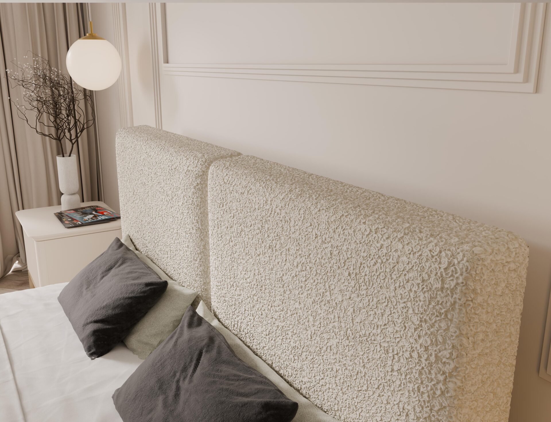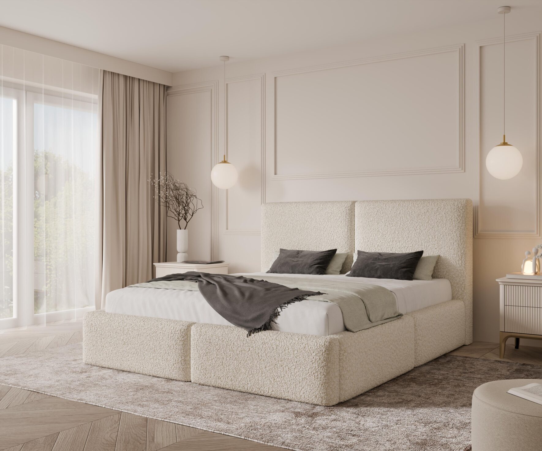 Wysokie, miękkie zagłowie oraz grube boczki zapewniają wygodę użytkowania na co dzień i przyjemne podparcie podczas odpoczynku. Solidna konstrukcja gwarantuje trwałość i stabilność przez lata. Szeroki wybór tkanin velvet, boucle i struktur umożliwia pełną personalizację łóżka pod każde wnętrze.