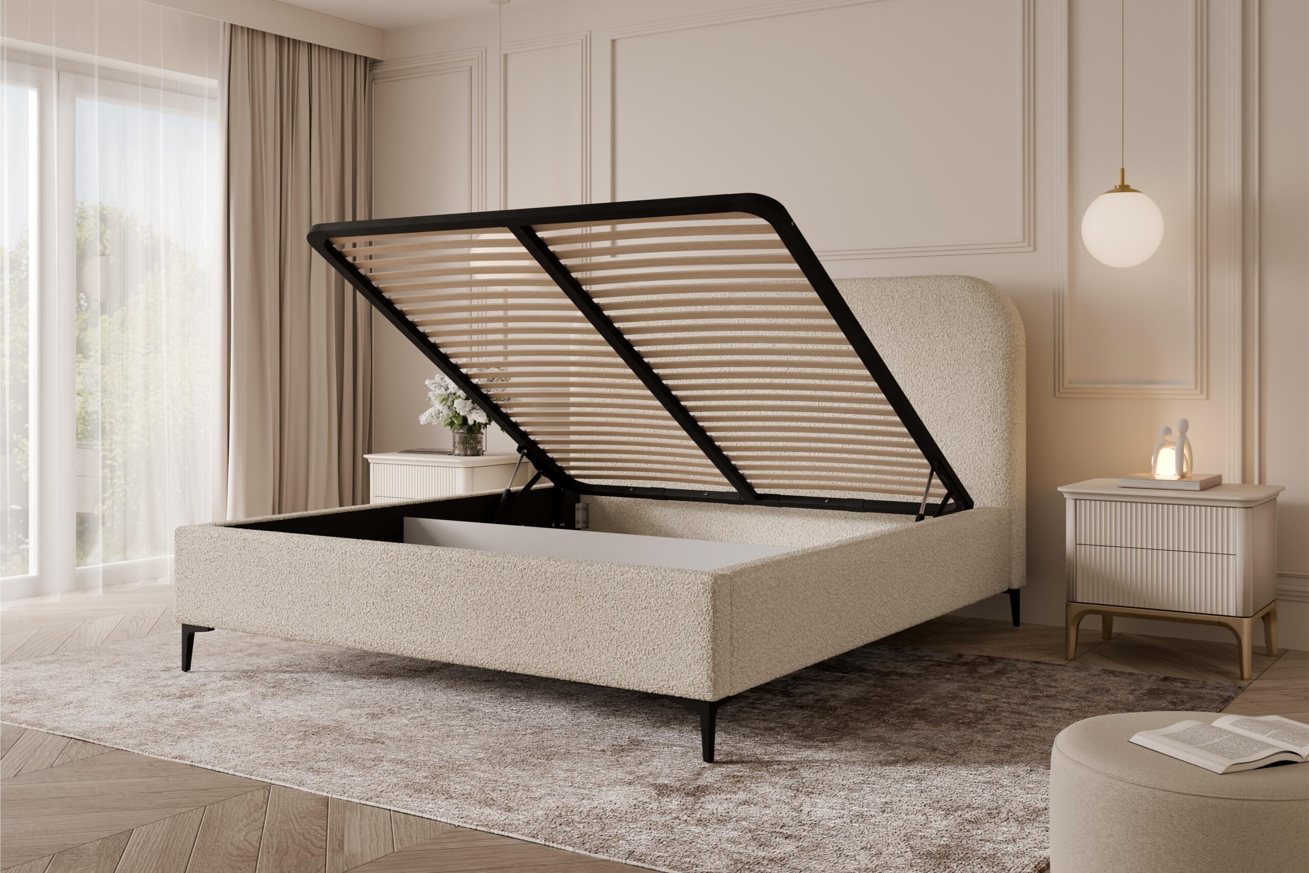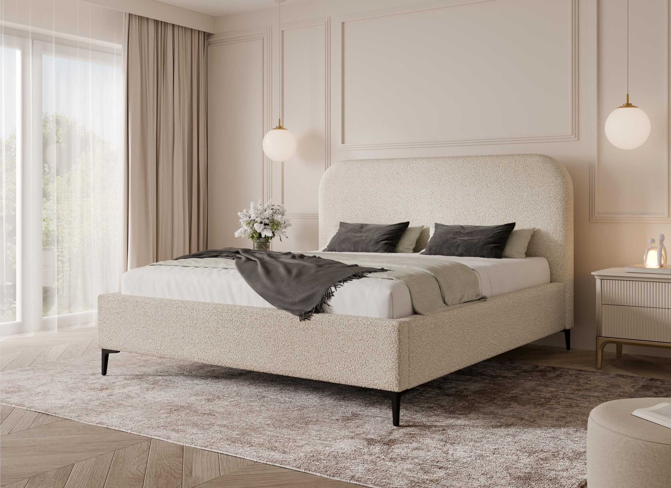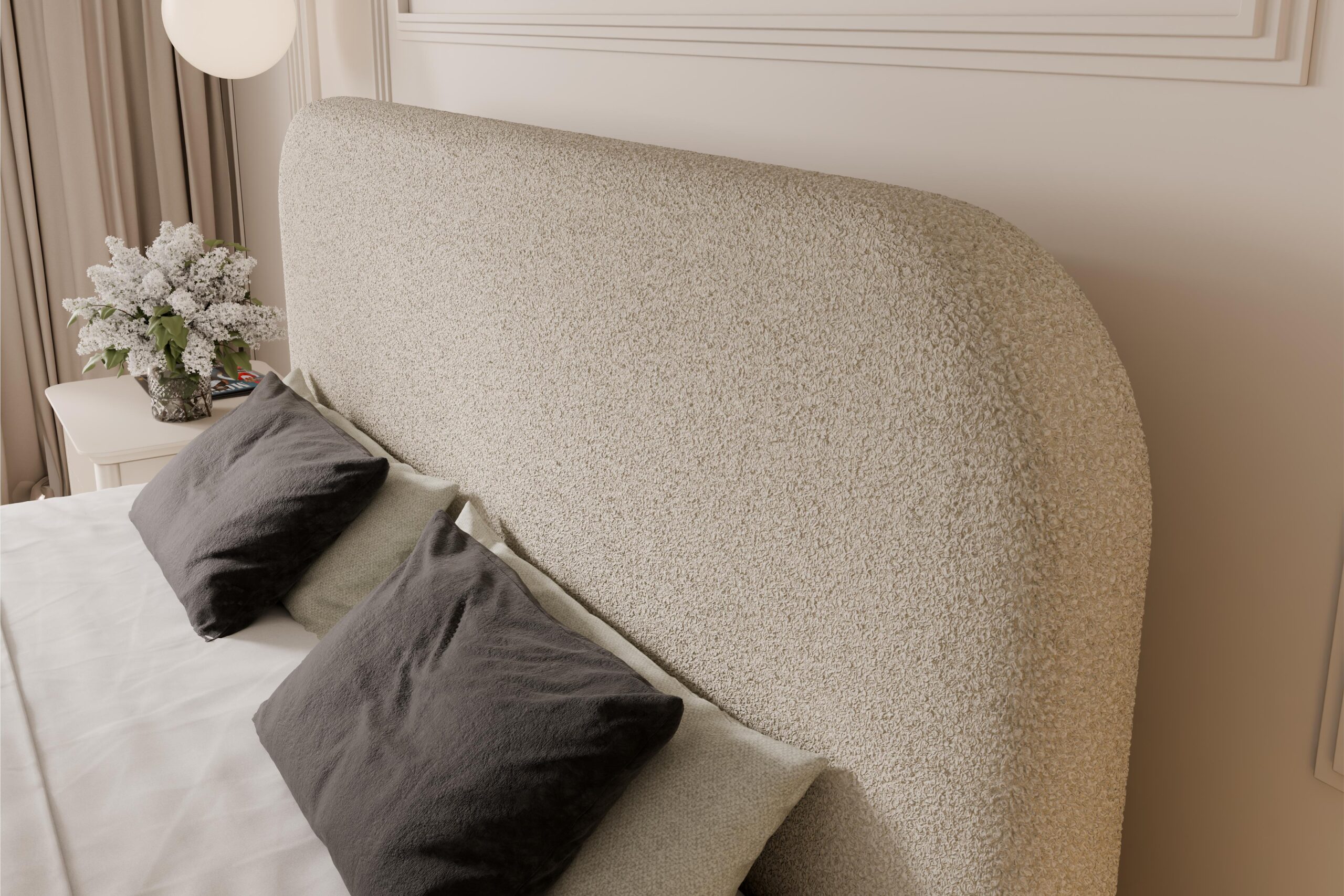 Miękkie, tapicerowane zagłowie o łagodnie zaokrąglonej formie zapewnia komfortowe podparcie podczas codziennego odpoczynku. Starannie zaprojektowana konstrukcja gwarantuje stabilność i trwałość na lata, a przyjemna w dotyku tkanina dodatkowo podnosi komfort użytkowania. Szeroka gama materiałów – od eleganckich velvetów, przez modne boucle, aż po wytrzymałe tkaniny strukturalne – pozwala idealnie dopasować łóżko do aranżacji wnętrza.