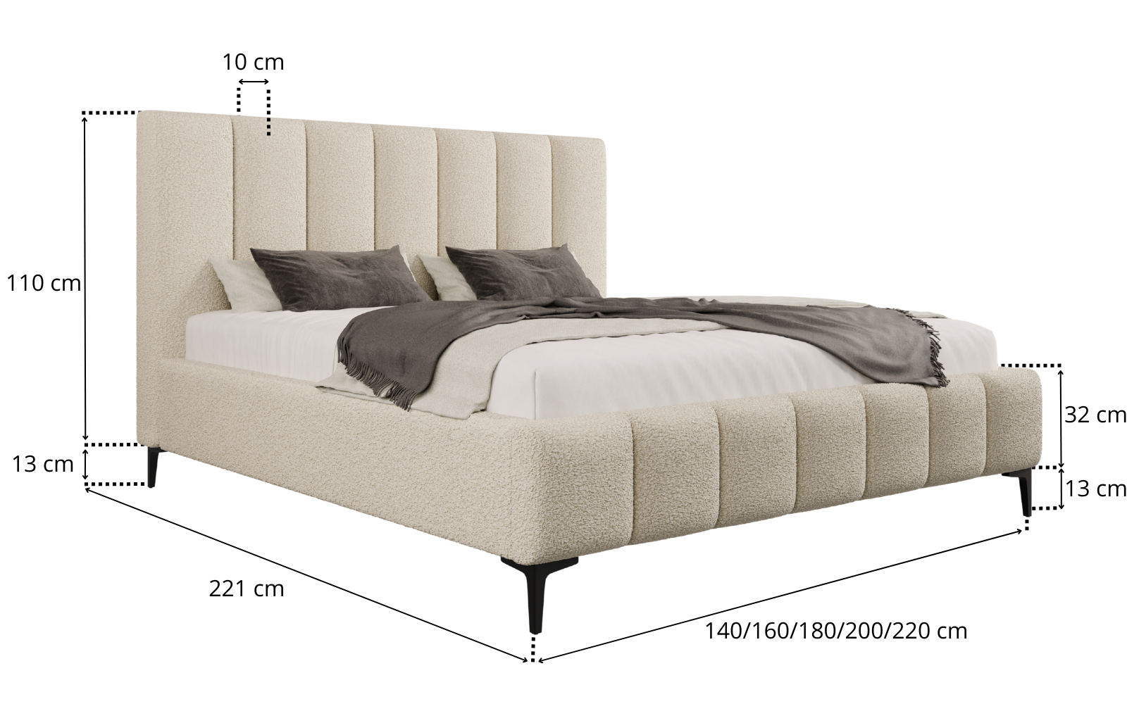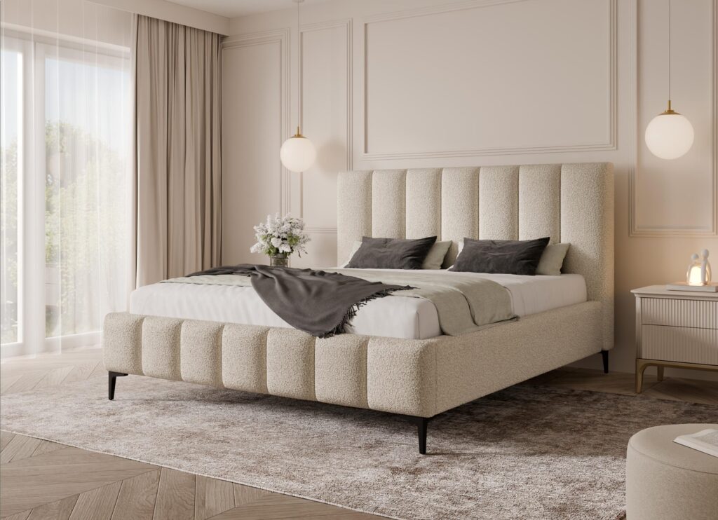 Miękkie, tapicerowane panele z pionowymi pasami zapewniają komfortowe podparcie podczas odpoczynku, a jednocześnie stanowią efektowny element dekoracyjny. Spójne wykończenie zagłowia oraz frontu łóżka podkreśla elegancki charakter i nadaje wnętrzu nowoczesnej estetyki. Solidna konstrukcja gwarantuje trwałość i stabilność na lata użytkowania. Szeroki wybór tkanin – od eleganckich velvetów, przez modne boucle, aż po wytrzymałe materiały strukturalne – pozwala dopasować łóżko do indywidualnych preferencji.