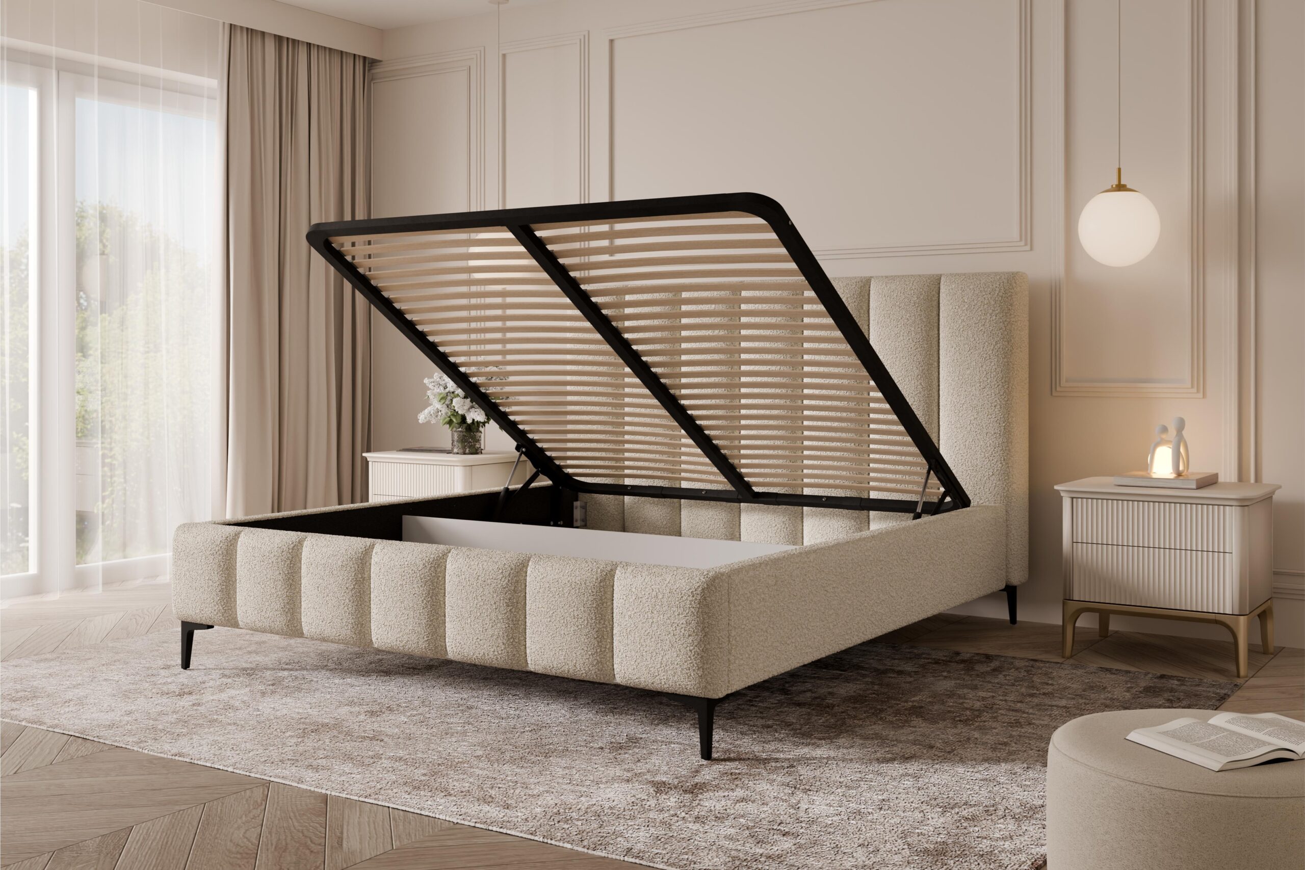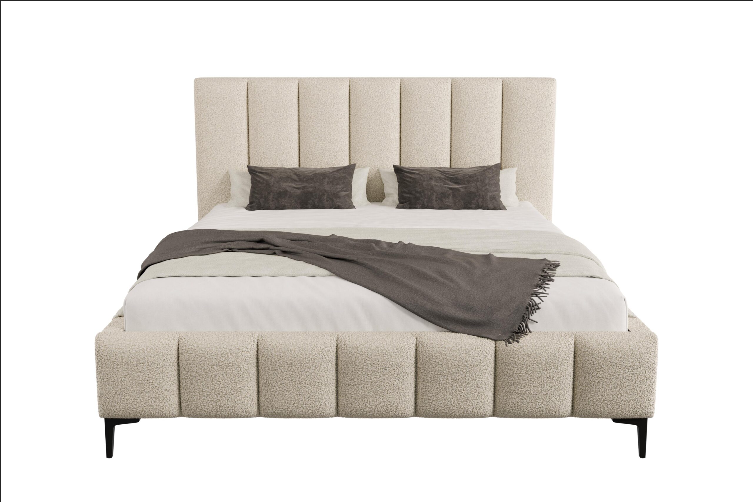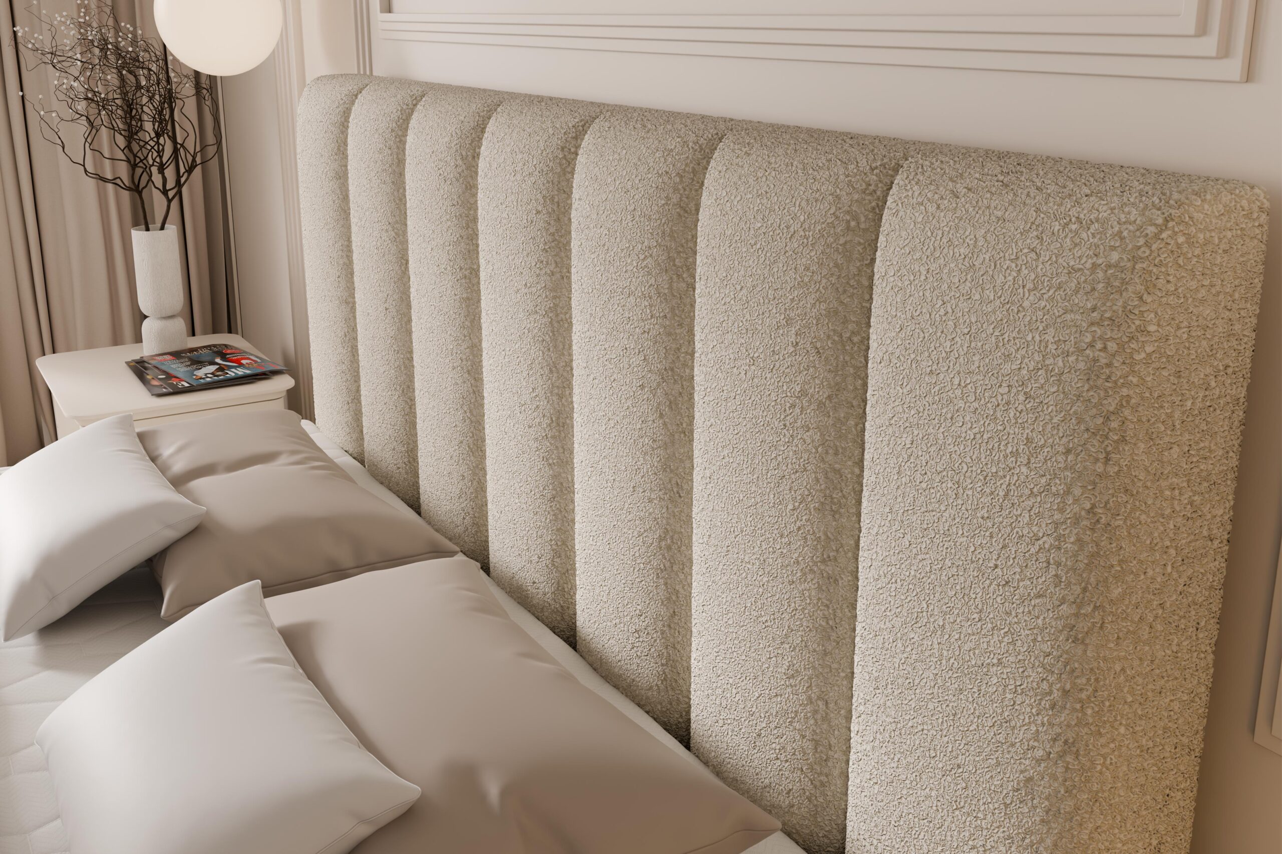 Miękkie, tapicerowane panele z pionowymi pasami zapewniają komfortowe podparcie podczas odpoczynku, a jednocześnie stanowią efektowny element dekoracyjny. Spójne wykończenie zagłowia oraz frontu łóżka podkreśla elegancki charakter i nadaje wnętrzu nowoczesnej estetyki. Solidna konstrukcja gwarantuje trwałość i stabilność na lata użytkowania. Szeroki wybór tkanin – od eleganckich velvetów, przez modne boucle, aż po wytrzymałe materiały strukturalne – pozwala dopasować łóżko do indywidualnych preferencji.