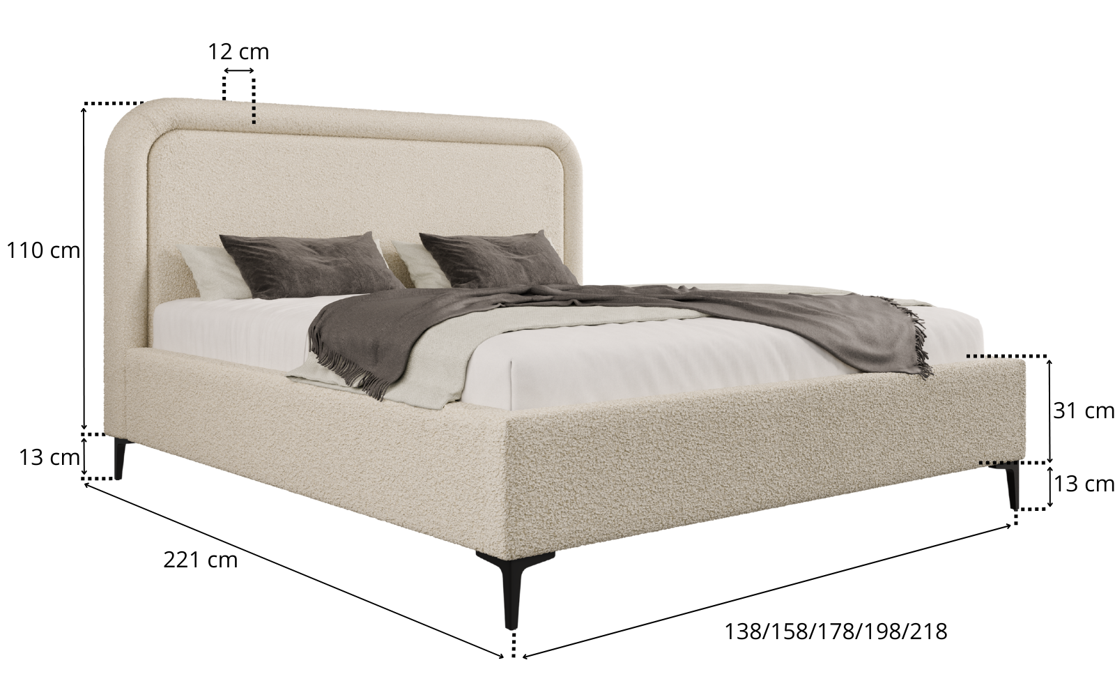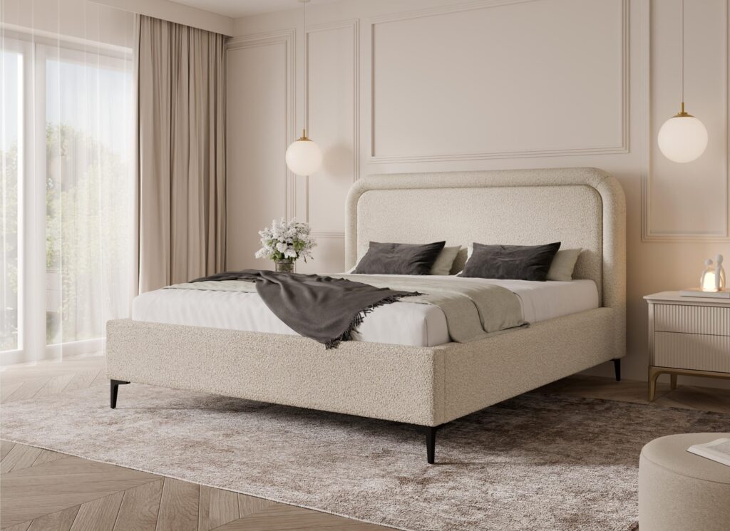Miękkie, tapicerowane zagłowie o zaokrąglonym kształcie zapewnia wygodne podparcie podczas odpoczynku i buduje przytulny klimat sypialni. Stabilna konstrukcja oraz staranne wykończenie gwarantują trwałość i komfort użytkowania na co dzień. Szeroki wybór tkanin – od eleganckich velvetów, przez modne boucle, aż po strukturalne materiały – pozwala dopasować łóżko idealnie do stylu wnętrza.