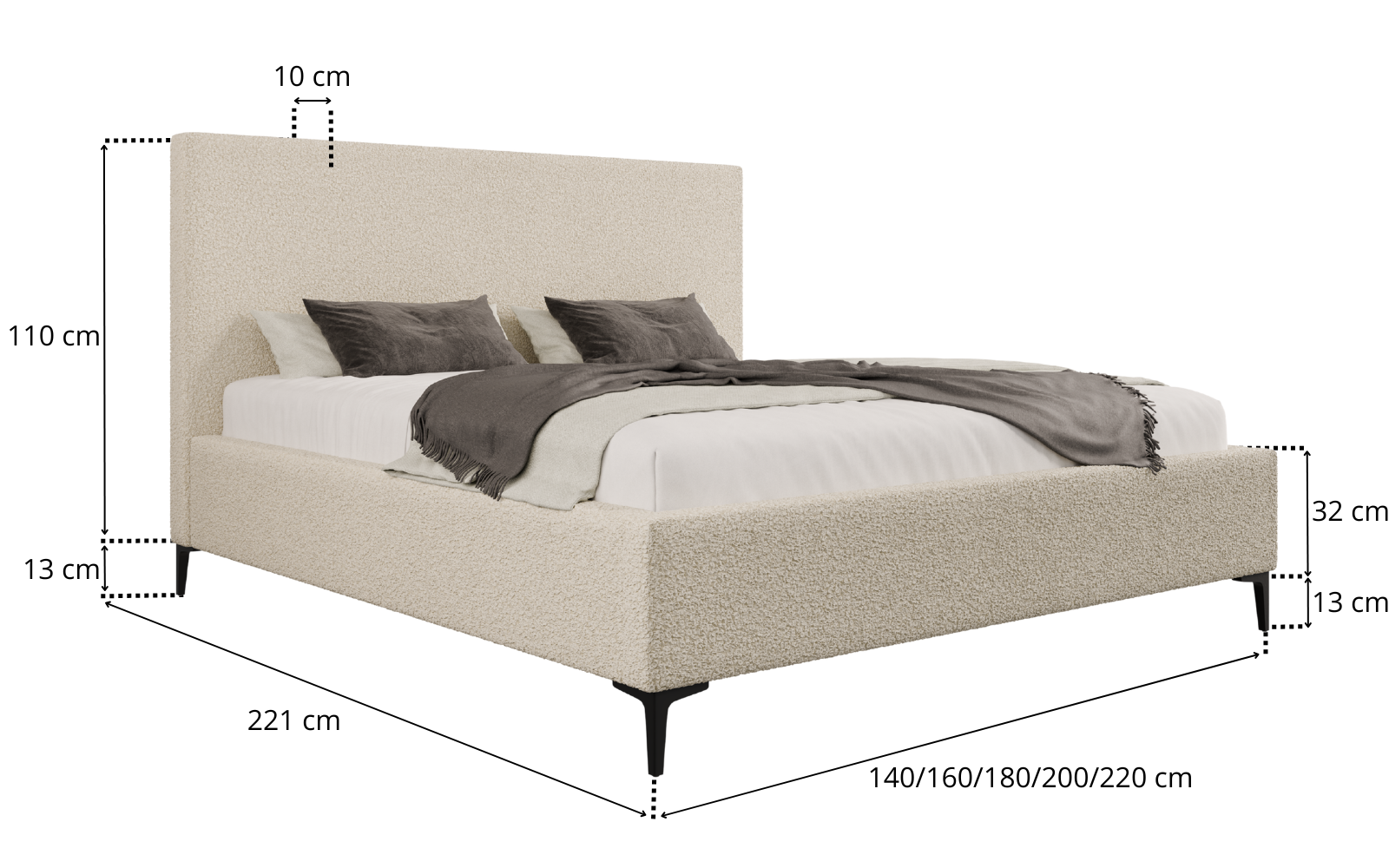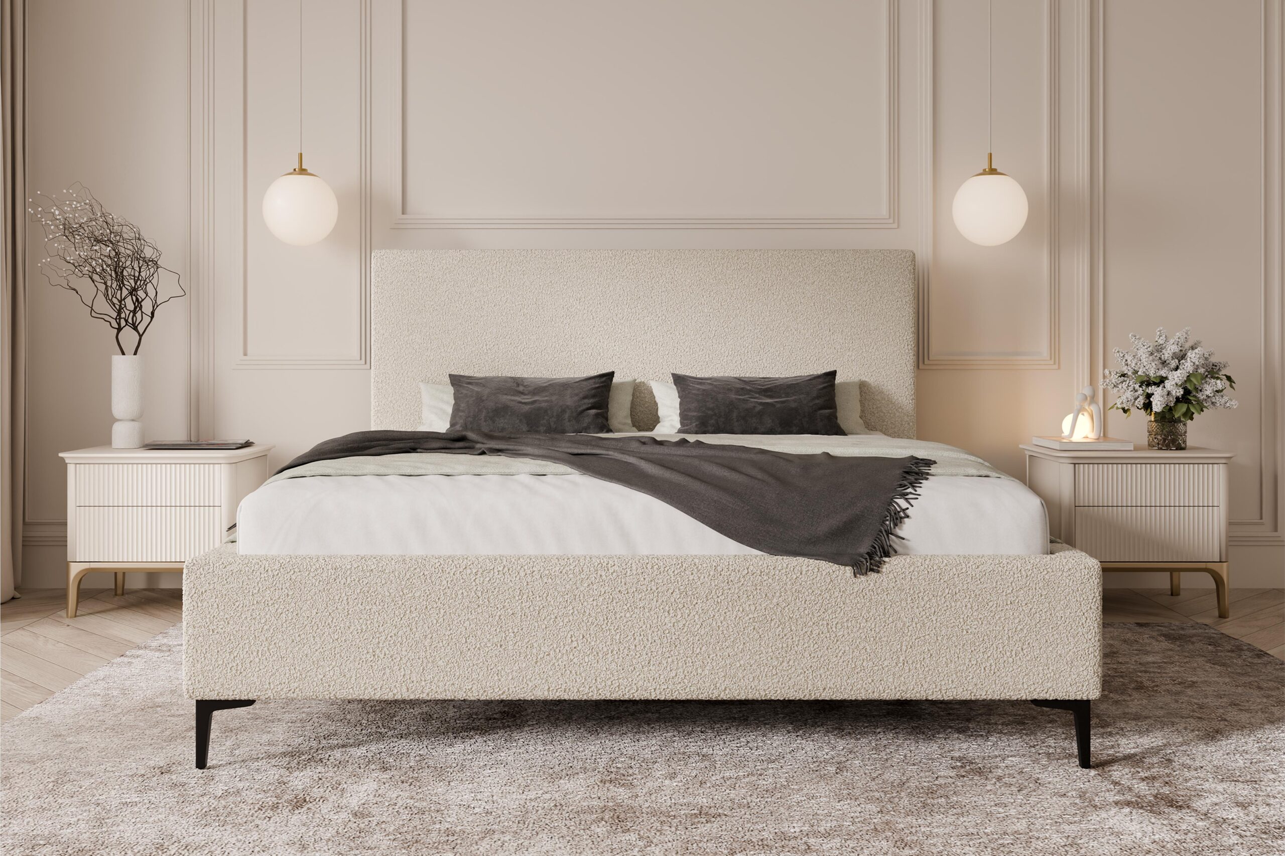 Proste, tapicerowane zagłowie zapewnia wygodne podparcie podczas odpoczynku i podkreśla nowoczesny charakter łóżka. Solidna konstrukcja oraz staranne wykonanie gwarantują trwałość i stabilność na lata użytkowania. Szeroki wybór tkanin – od eleganckich velvetów, przez modne boucle, aż po wytrzymałe materiały strukturalne – umożliwia pełne dopasowanie łóżka do indywidualnych preferencji i stylu wnętrza.