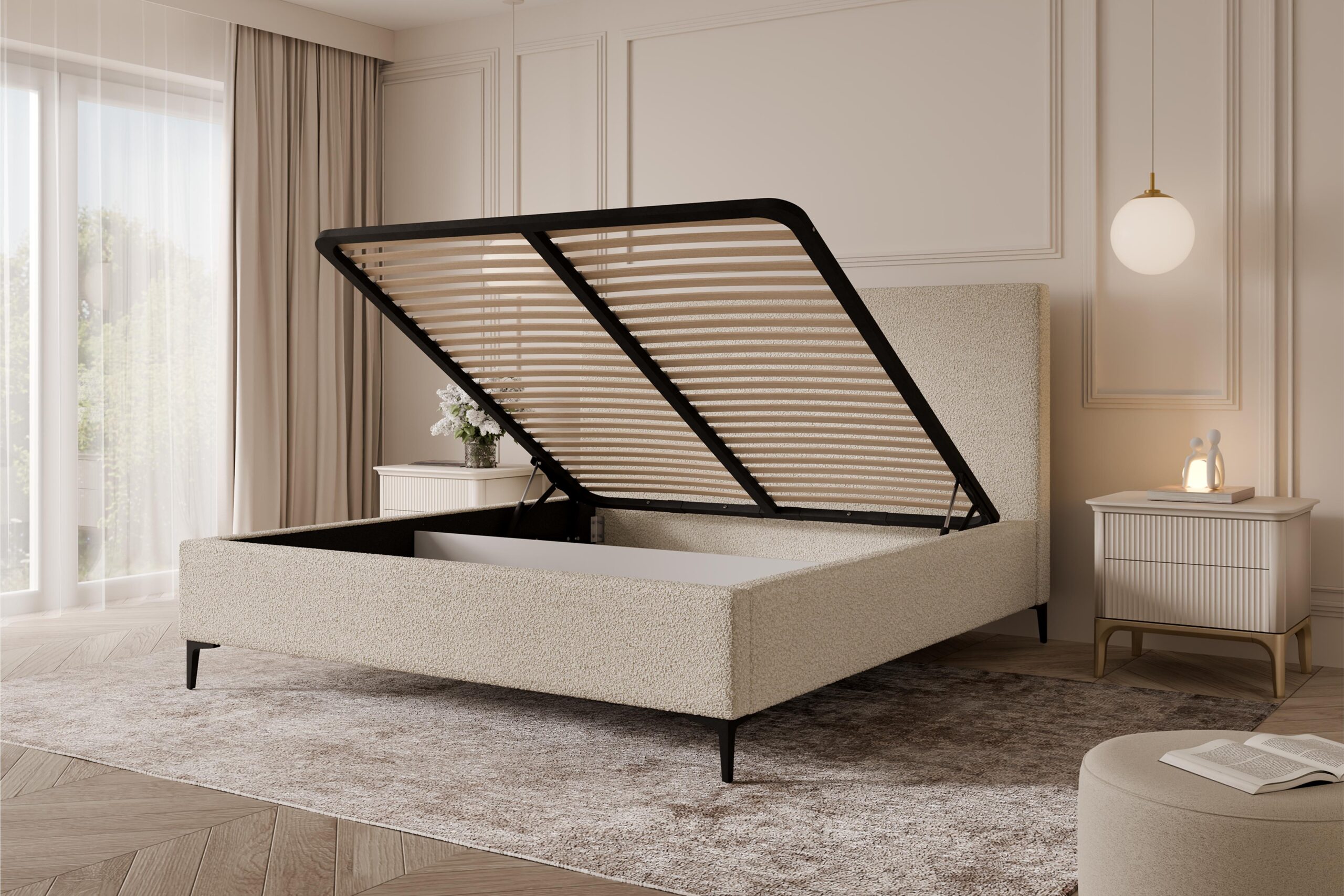 Łóżko osadzone na smukłych, metalowych nóżkach nadaje konstrukcji lekkości i współczesnego charakteru, który świetnie sprawdzi się w nowoczesnych oraz minimalistycznych wnętrzach. Przestrzeń pod łóżkiem ułatwia utrzymanie czystości oraz poprawia cyrkulację powietrza, zwiększając komfort codziennego użytkowania. MONA 1 UP to połączenie funkcjonalności, estetyki i wygody.