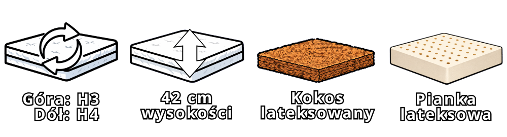 Dwupoziomowa konstrukcja oparta na sprężynach kieszeniowych, kokosie, lateksie i piankach FLEXI FOAM zapewnia doskonałe podparcie, wysoki komfort i bardzo dobrą trwałość przez wiele lat użytkowania.